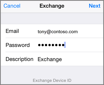 3. Enter your full email address, for example tony@contoso.com, and your password, and then tap Next.
